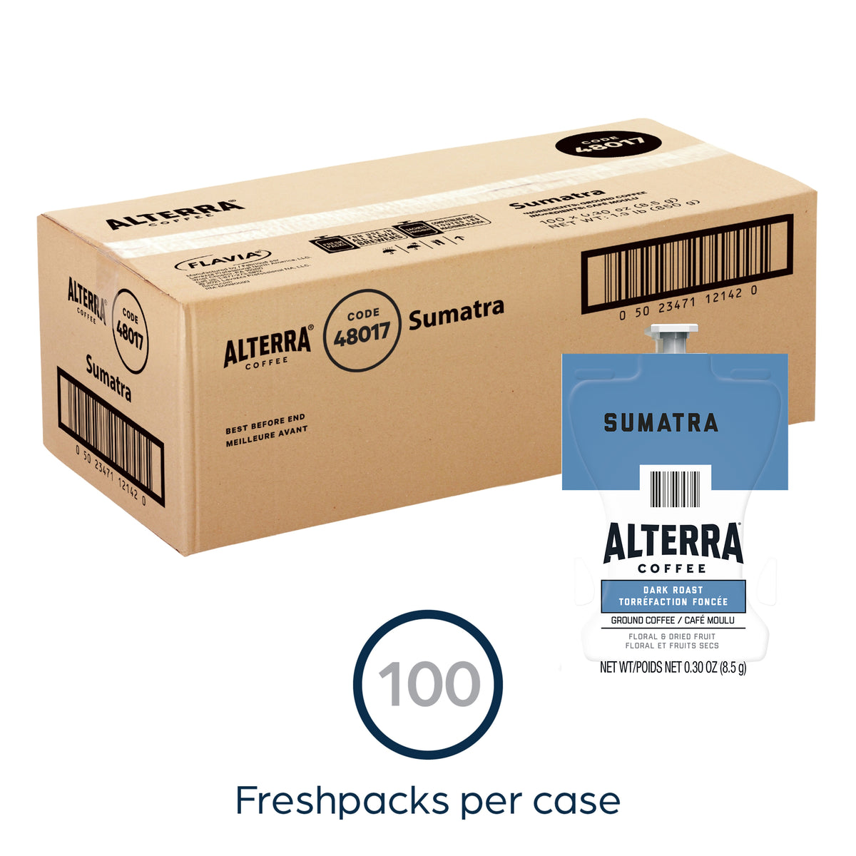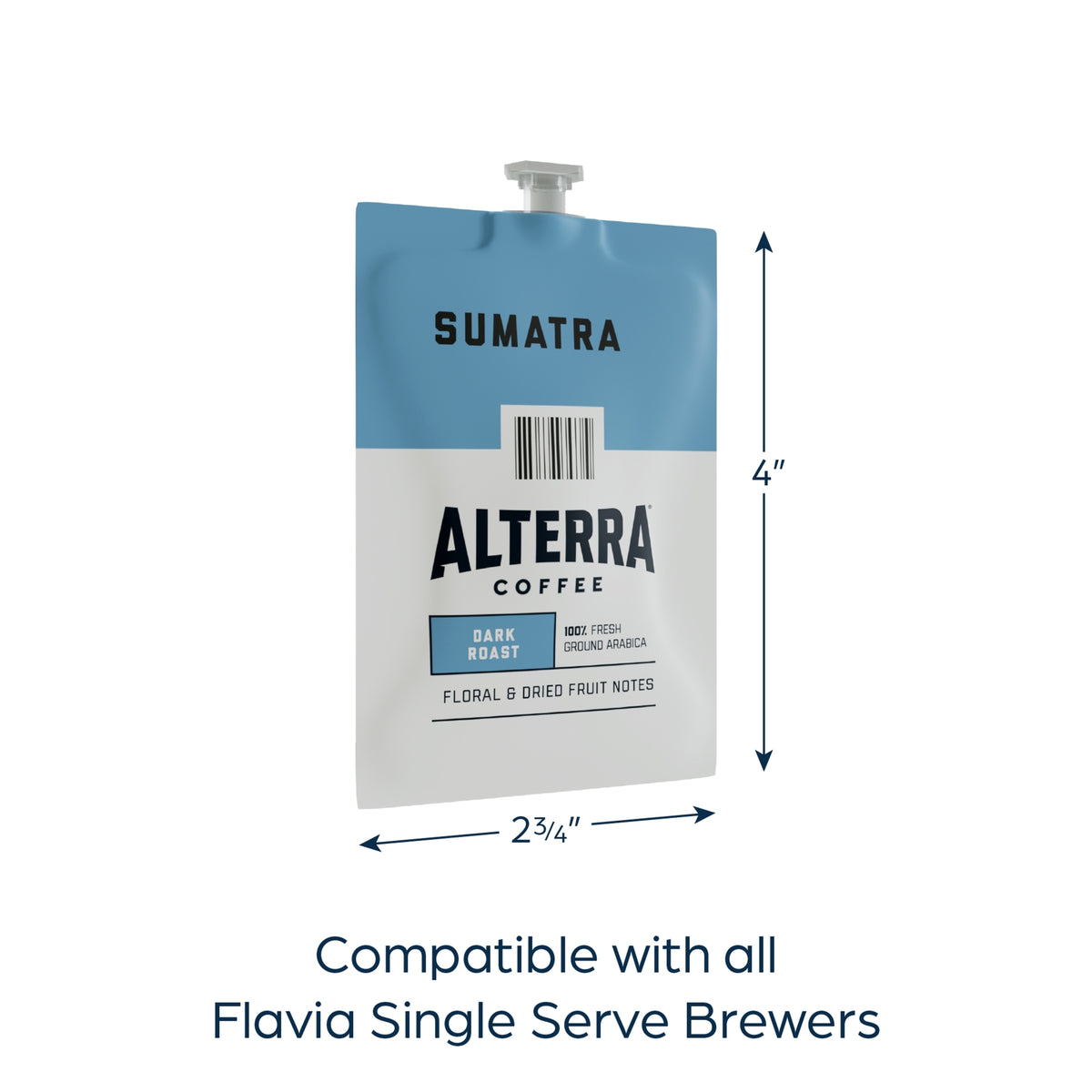 Alterra® Sumatra Coffee is a dark roast blend that makes a full-bodied, complex cup with a bold finish. Made for your Flavia® Brewer, this Freshpack produces drip coffee.