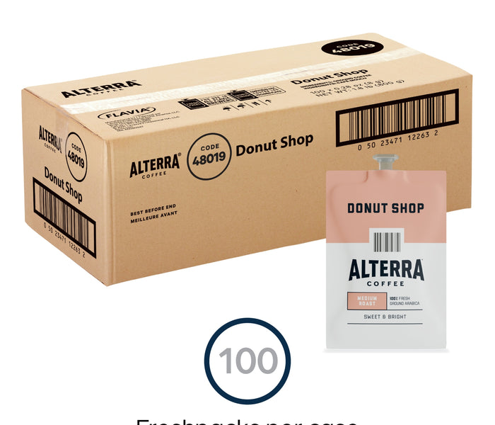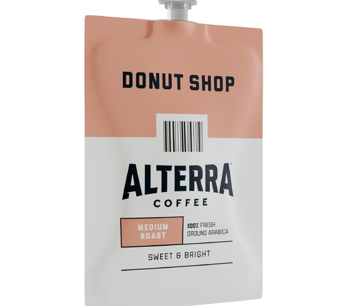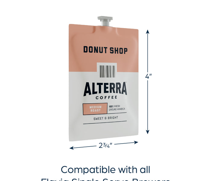 Alterra® Donut Shop Coffee is an Arabica medium roast blend featuring sweet and bright aromatic notes to start your day. Made for your Flavia® Brewer, this Freshpack produces drip coffee.